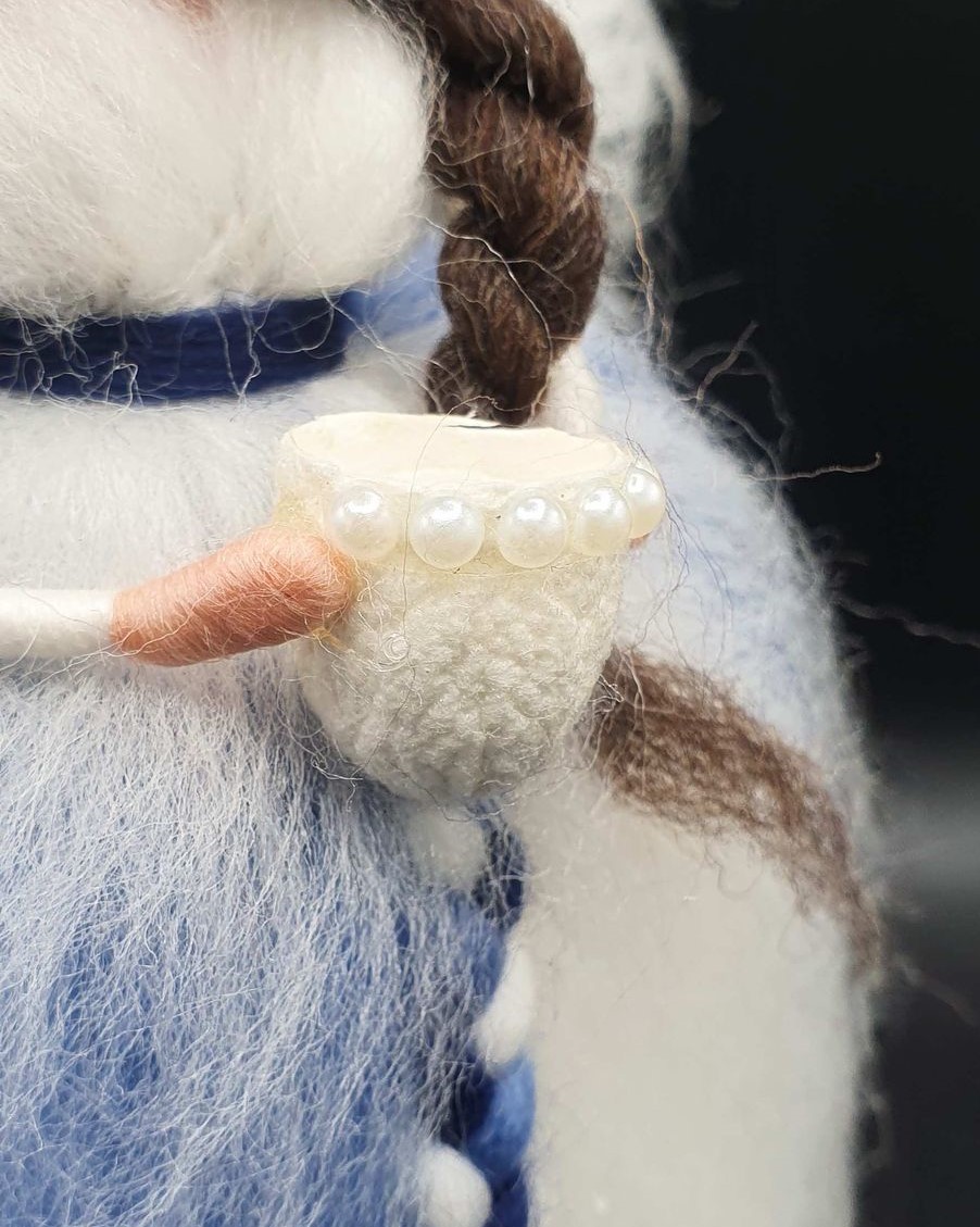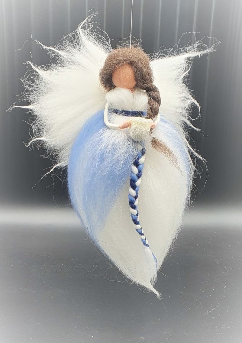 Das Kleid der Elfe ist verziert durch ein geflochtenes Zöpfchen. Ihre Haare bestehen aus ungefärbter Schafwolle, die Frisur ist zu eunem eleganten Zopf gedreht.
