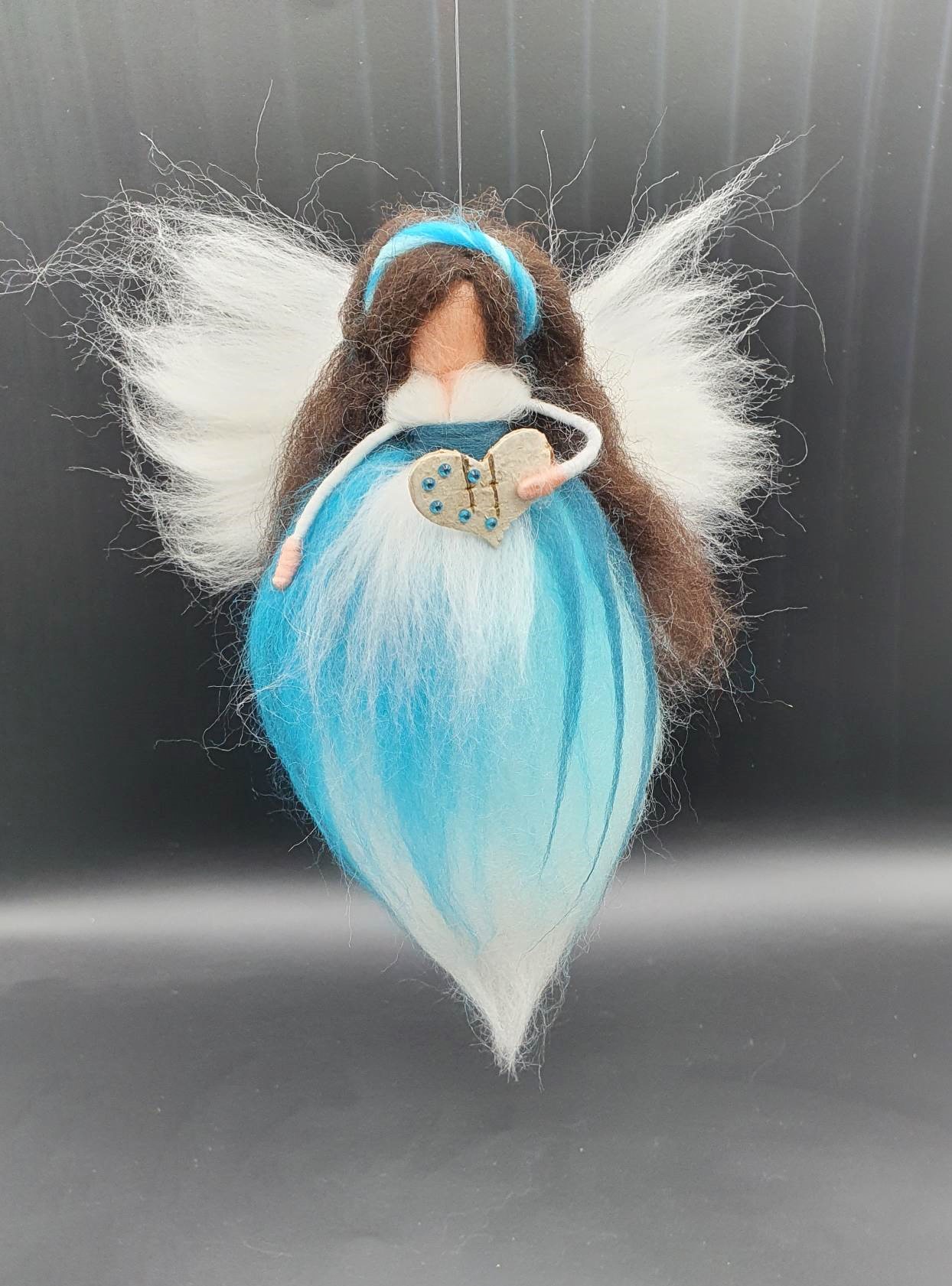 Ein Naturherz mit Glitzersteinchen - dies wird von der zarten Elfe in der Hand gehalten. Weiße und türkisfarbene, feinste Schafwolle - dies sind die Hauptbestandteile dieser Elfe. Das Herz wurde aus Birkenrinde gefertigt und mit türkisfarbenen Glitzersteinchen verziert.